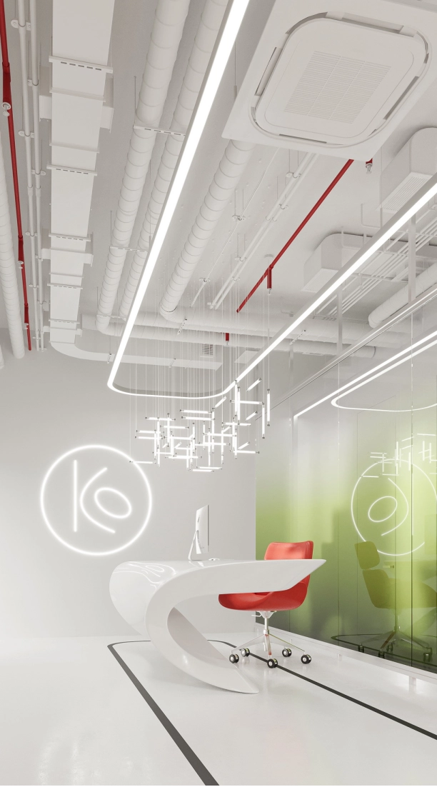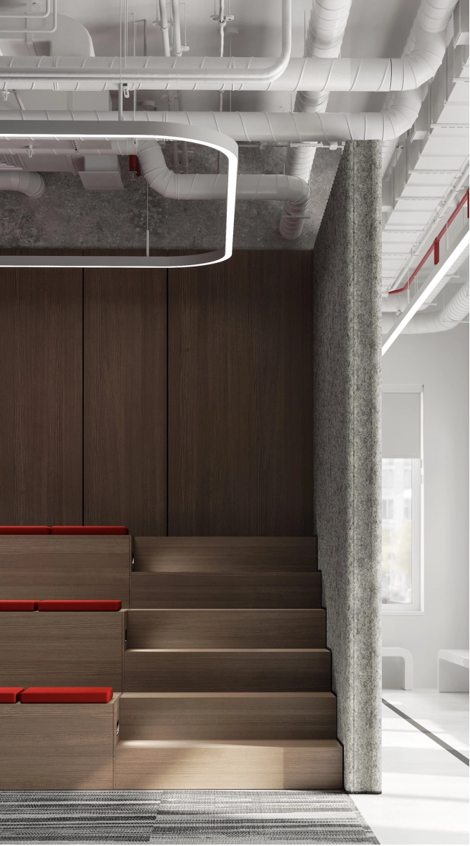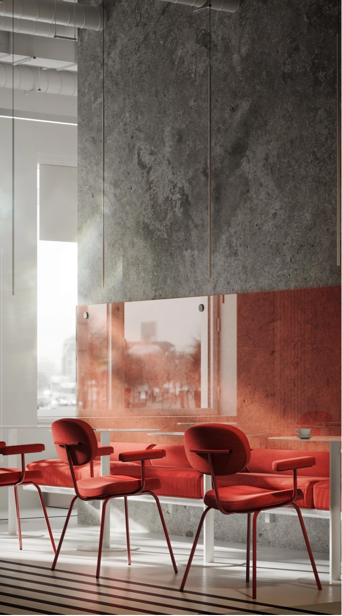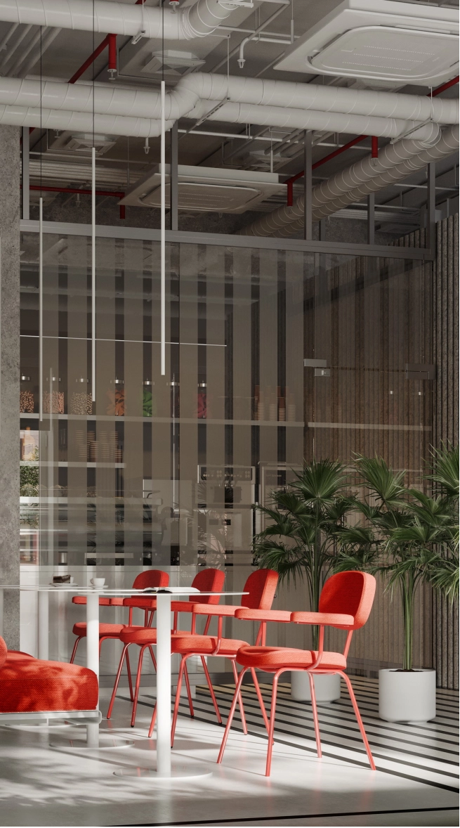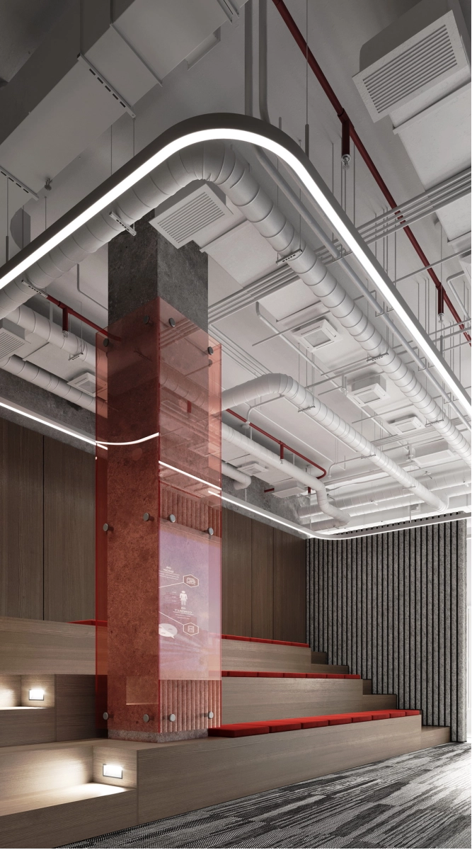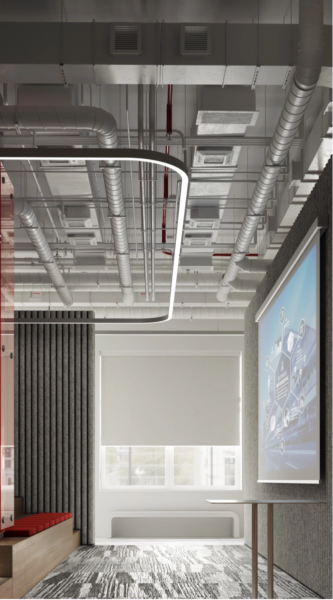 В рамках проекта была разработана концепция офисного пространства с детальной проработкой планировки и функционального зонирования. Помещение включает ресепшен, гардеробную, санитарный блок, кафе с кухней, конференц-зал, кабинет директора, переговорную и основную рабочую зону. Планировочное решение выстроено таким образом, чтобы обеспечить удобную навигацию.