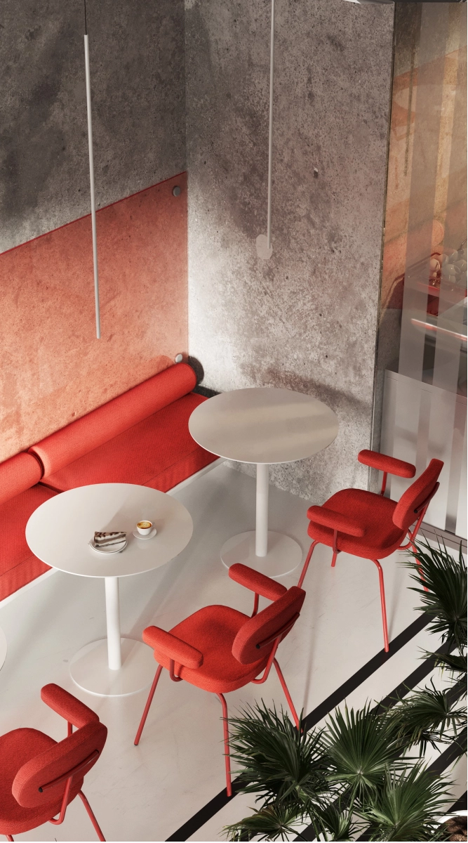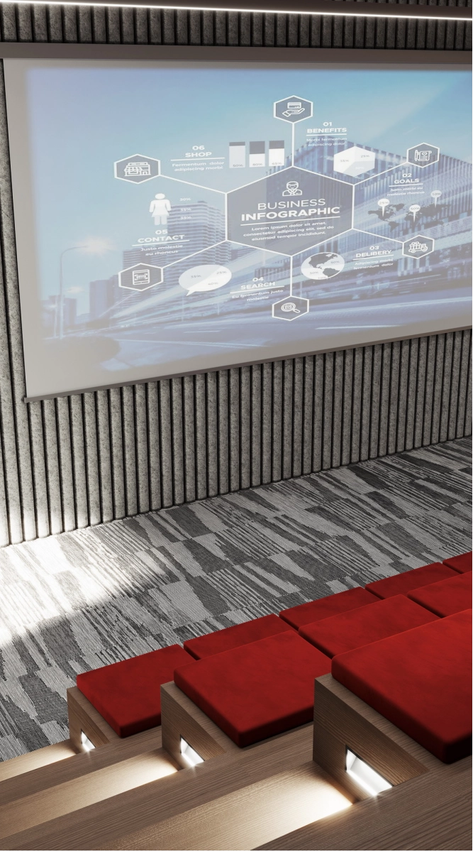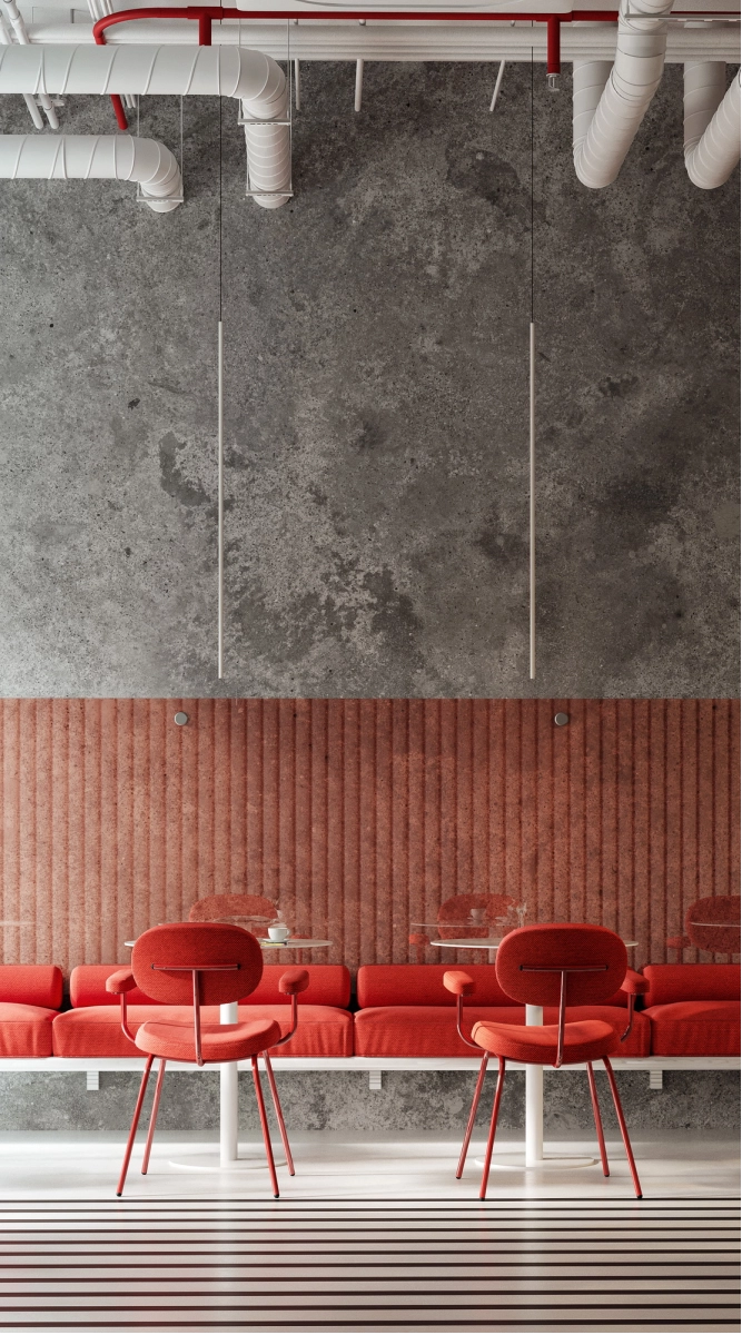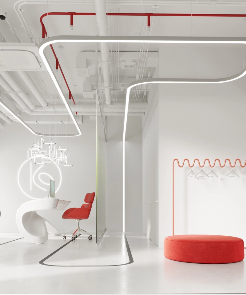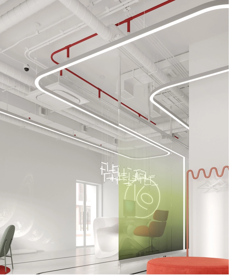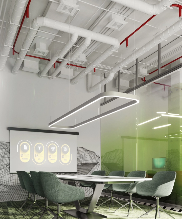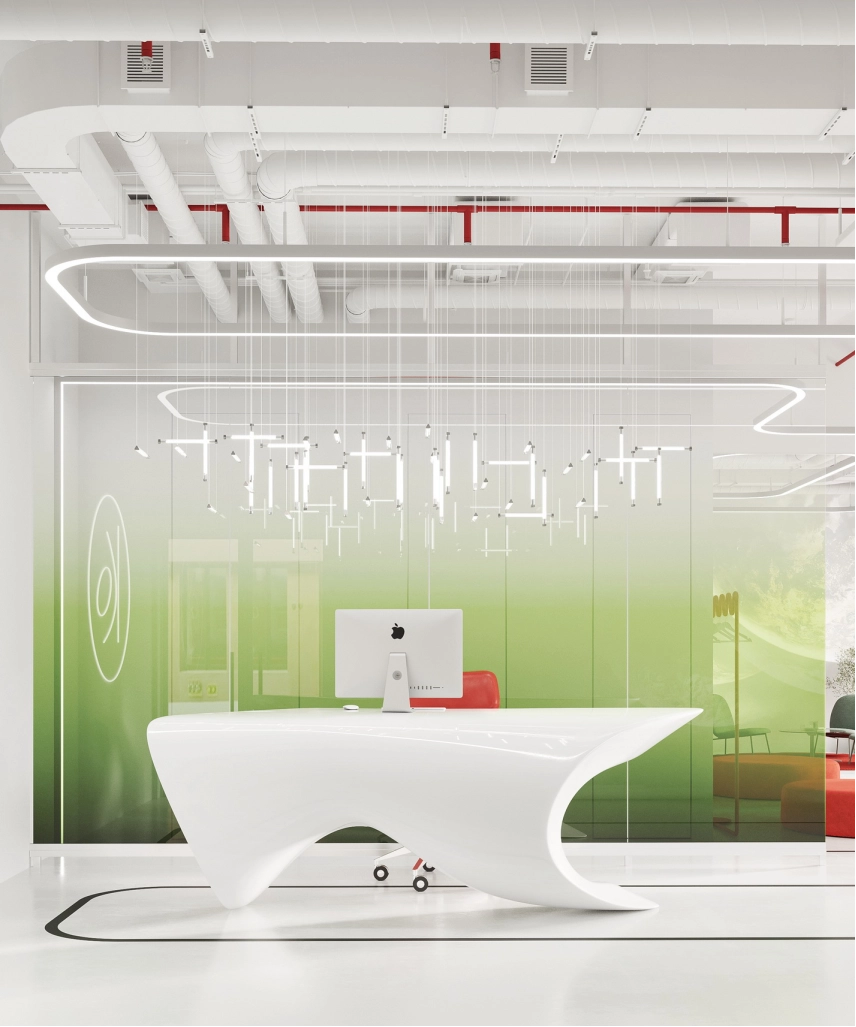В рамках проекта была разработана концепция офисного пространства с детальной проработкой планировки и функционального зонирования. Помещение включает ресепшен, гардеробную, санитарный блок, кафе с кухней, конференц-зал, кабинет директора, переговорную и основную рабочую зону. Планировочное решение выстроено таким образом, чтобы обеспечить удобную навигацию.