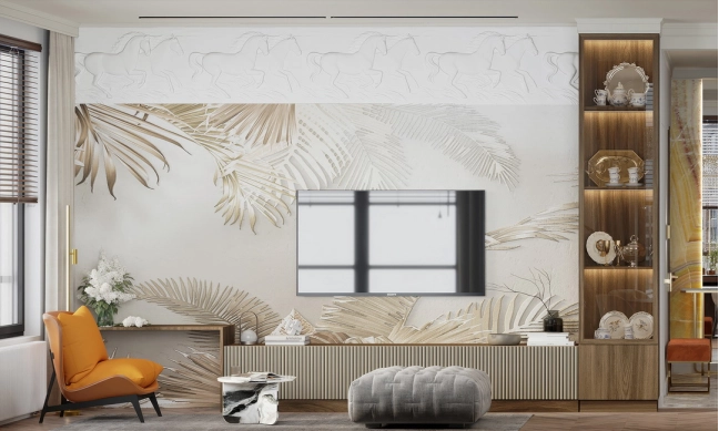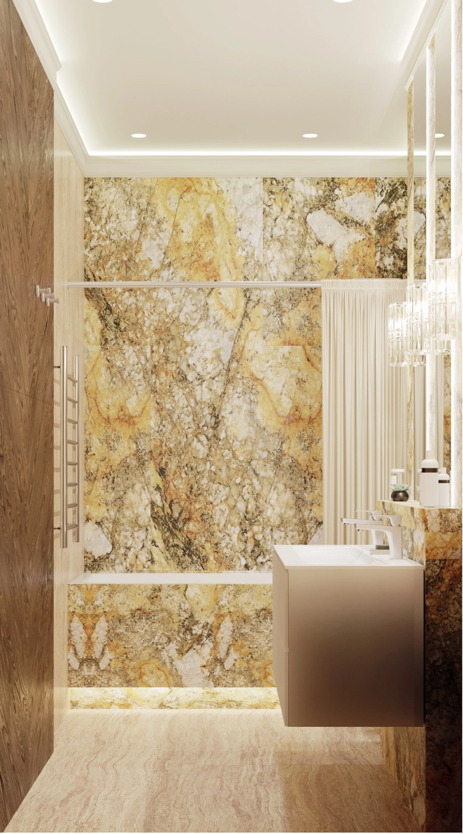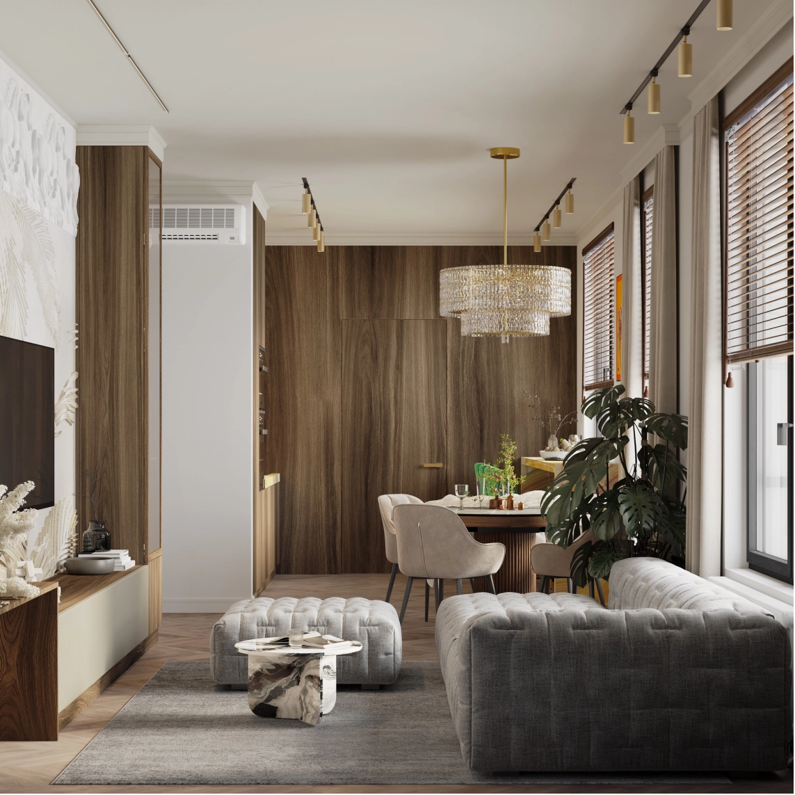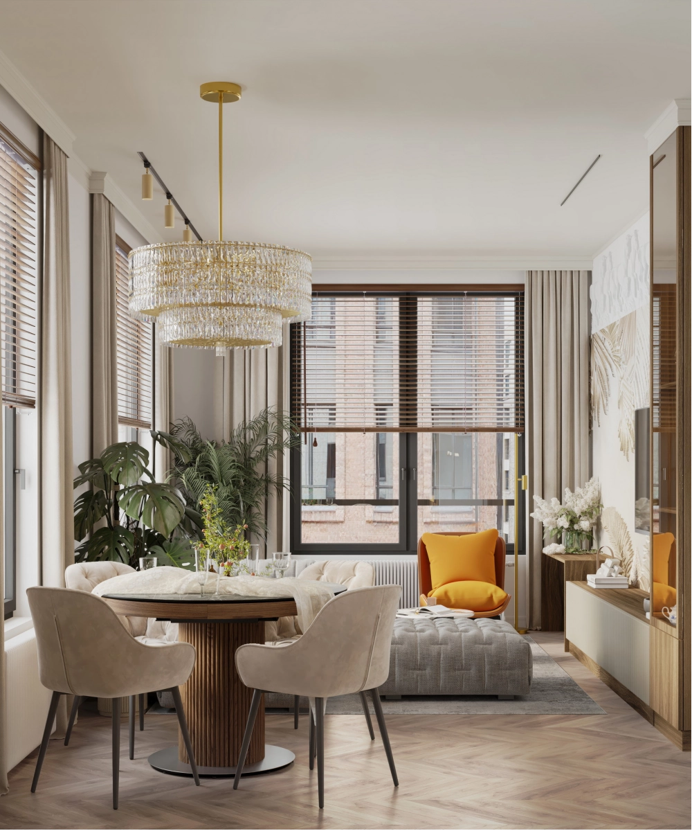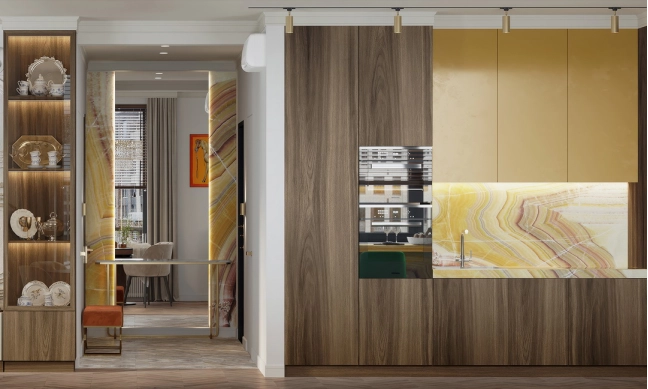 Напротив зеркала в прихожей разместится обеденный стол с акцентной люстрой. В зоне отдыха — комфортный диван от Boca. На стене с телевизором под потолком предусмотрен барельеф, а саму стену за телевизором планируется декорировать камнем или росписью. ТВ-тумба будет подвесной или выполнена в пол с цоколем. Слева от ТВ-тумбы, у окна, организуется небольшое рабочее место, а справа — кухня с гарнитуром и столешницей из оникса. Напротив кухни разместится барный стол из того же материала, а посудный ящик будет в нижней секции гарнитура.