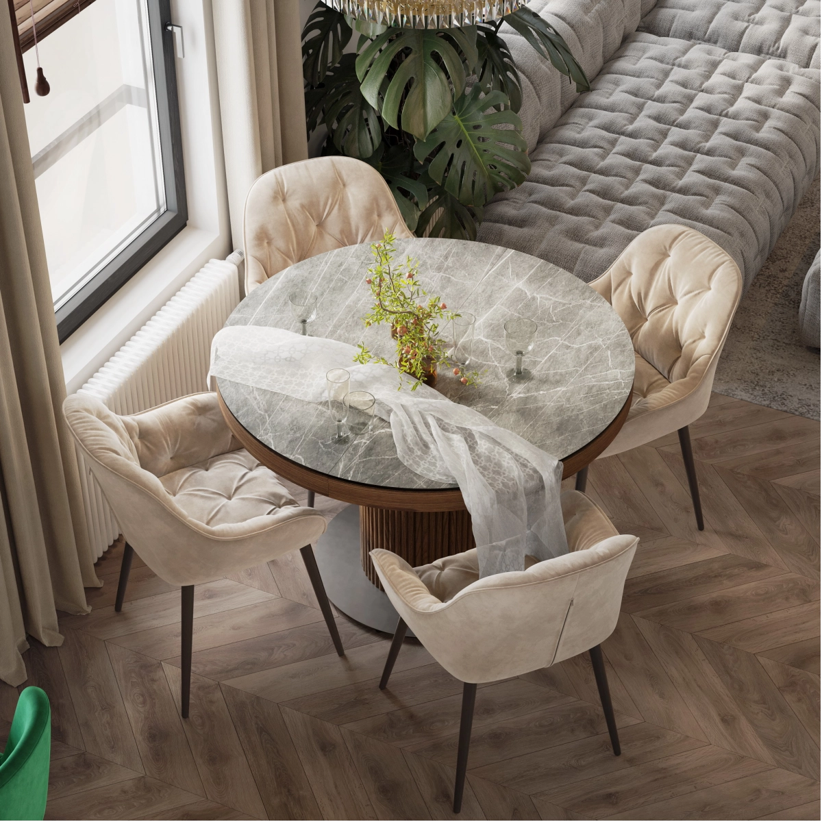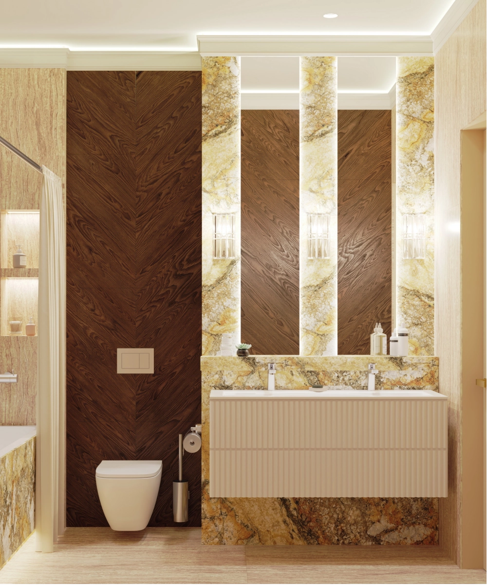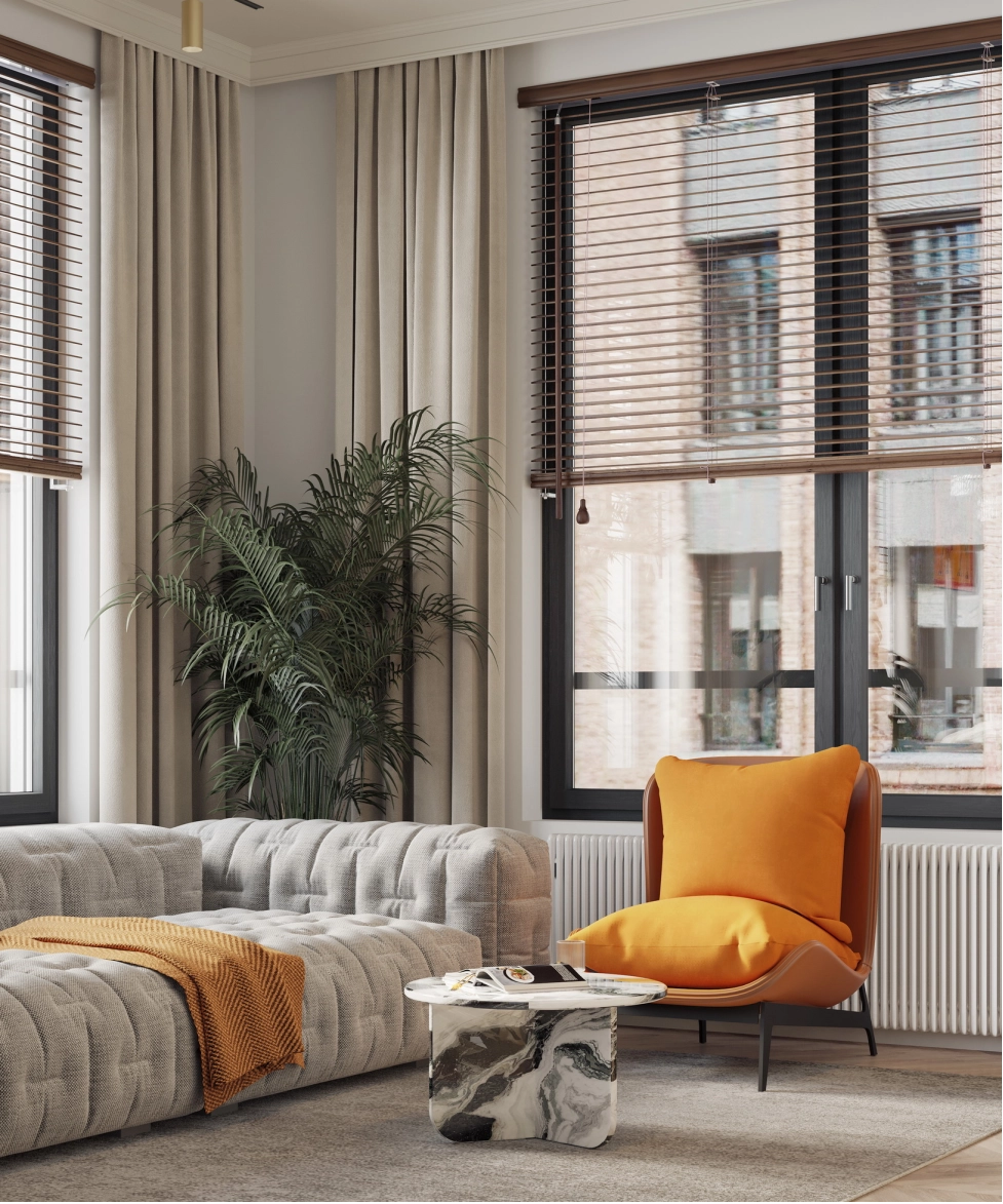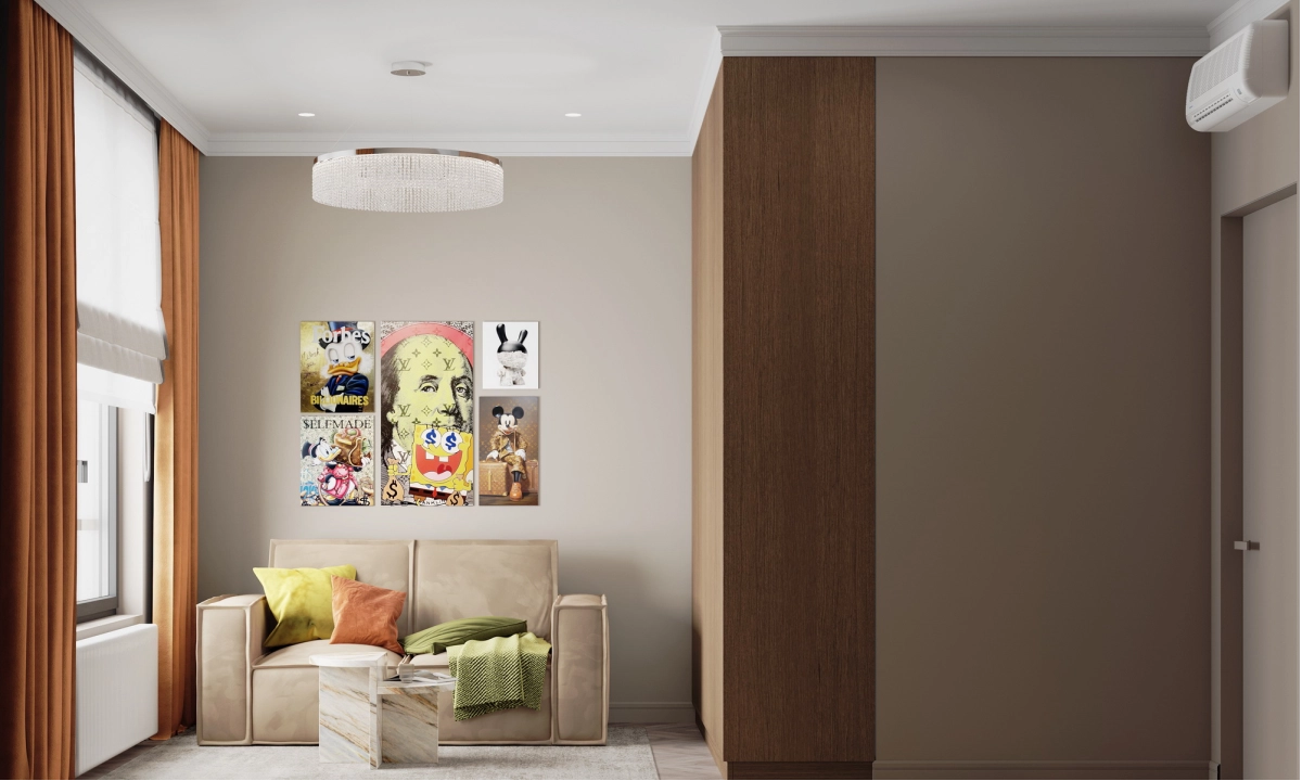 Напротив зеркала в прихожей разместится обеденный стол с акцентной люстрой. В зоне отдыха — комфортный диван от Boca. На стене с телевизором под потолком предусмотрен барельеф, а саму стену за телевизором планируется декорировать камнем или росписью. ТВ-тумба будет подвесной или выполнена в пол с цоколем. Слева от ТВ-тумбы, у окна, организуется небольшое рабочее место, а справа — кухня с гарнитуром и столешницей из оникса. Напротив кухни разместится барный стол из того же материала, а посудный ящик будет в нижней секции гарнитура.