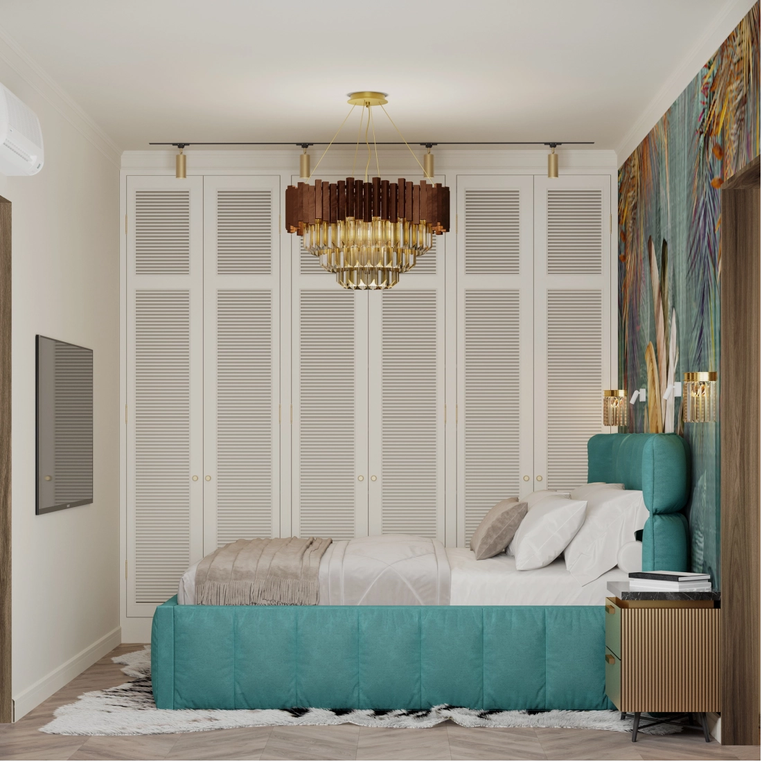 Основные оттенки интерьера — светлые и теплые. Мастер-спальня будет оформлена в тропическом стиле с использованием растительного рисунка, принтов и текстуры дерева.