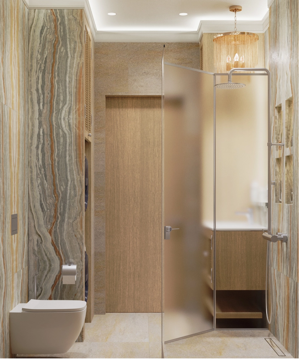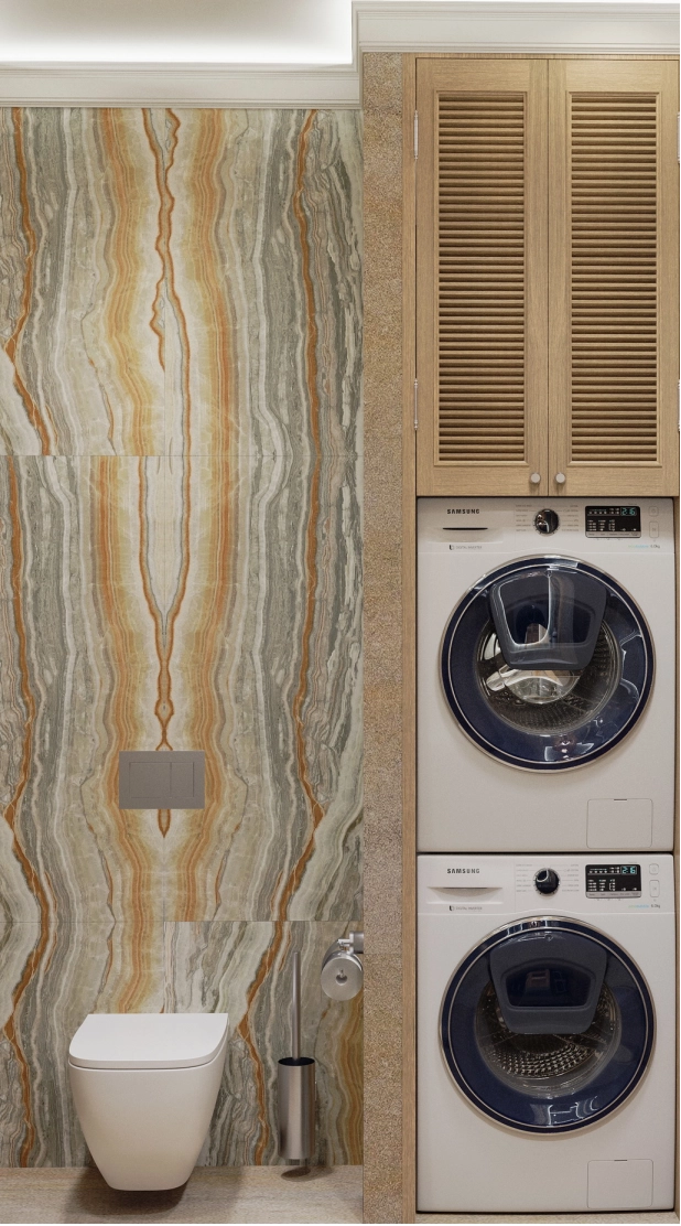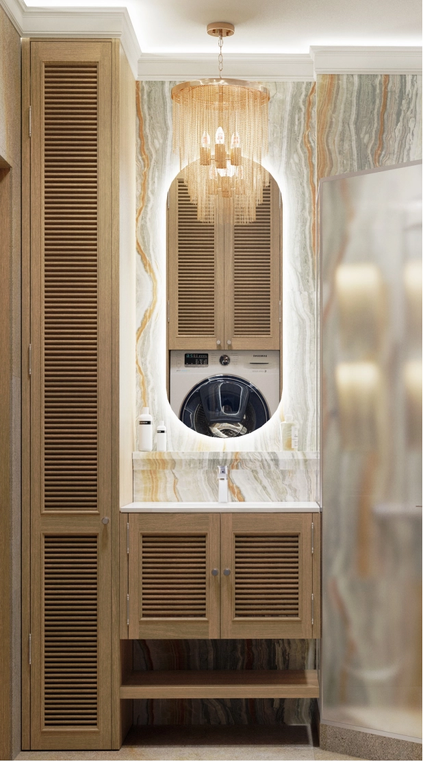 Санузел в мастер-спальне будет оснащен душем и тумбой для хранения кремов хозяйки. Для стиральной и сушильной машин предусмотрены удобные места, а также будет организовано комфортное место для сушки вещей, которые нельзя сушить в сушильной машине. Гладильная доска и утюг будут расположены рядом с гардеробной.