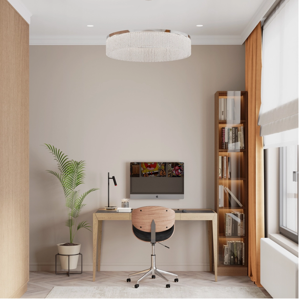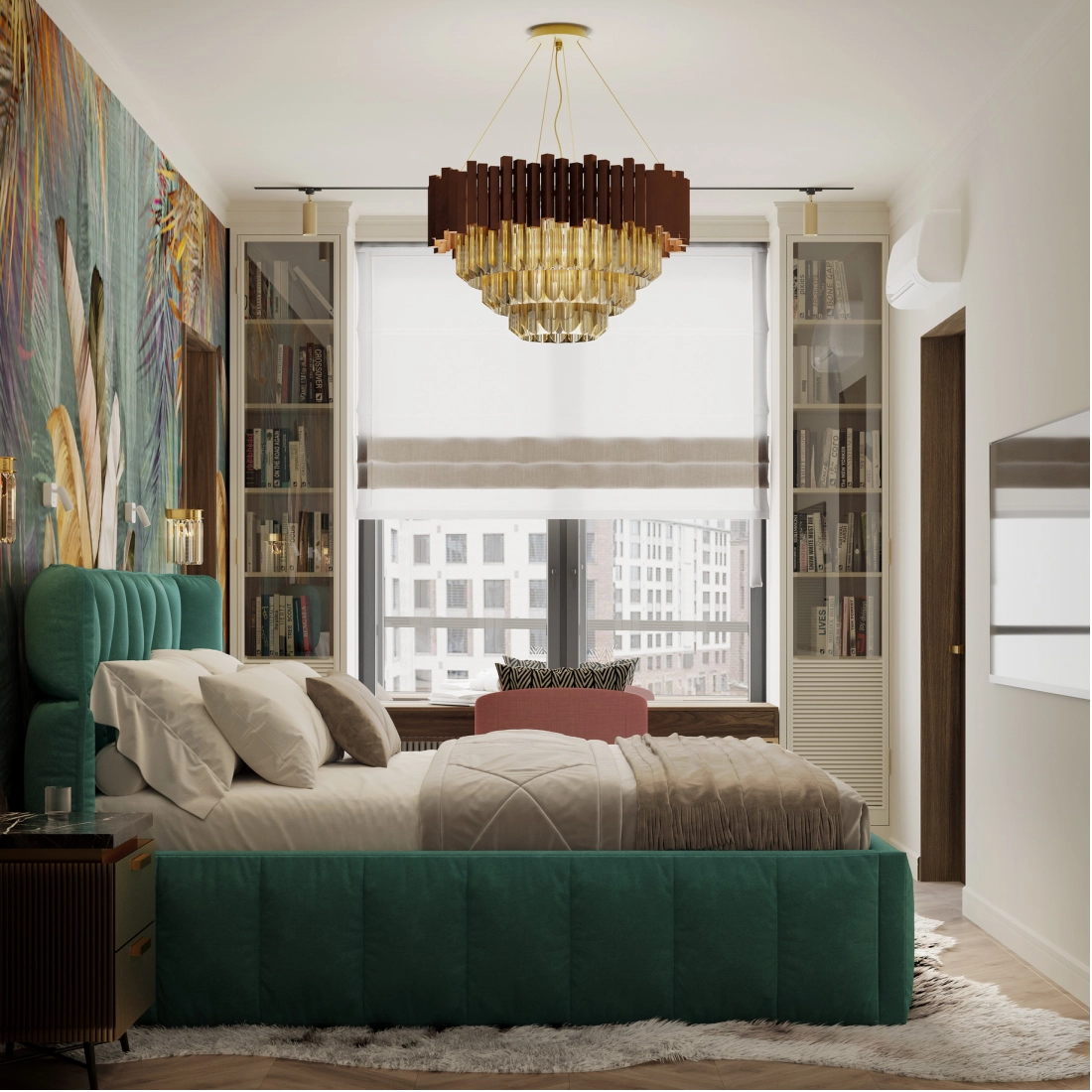 В спальне предусмотрена кровать с матрасом 180x200 см и прикроватные тумбы. Также разместятся 4 бра (2 из которых предназначены для чтения). На всю стену будет установлен шкаф для хранения с глубиной 450 мм. У окна — рабочий стол, по бокам от него — стеллажи для хранения рабочих документов. В этой зоне также разместится зеркало для ежедневного макияжа и хранения косметики.