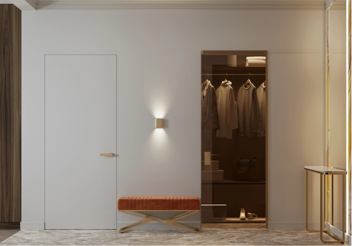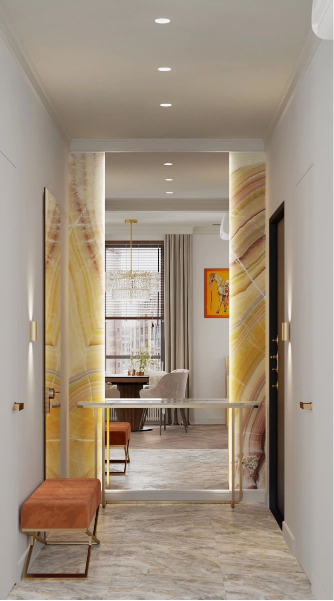 В прихожей предусмотрено большое зеркало, которое занимает всю стену напротив окна, с консолью вдоль зеркала. Для мягкого освещения установлены бра, расположенные напротив друг друга. Дверь в гардеробную сделана раздвижной, а потолок в зоне прихожей опускается на 150-230 мм от чернового потолка за счет размещения вентиляционного оборудования.